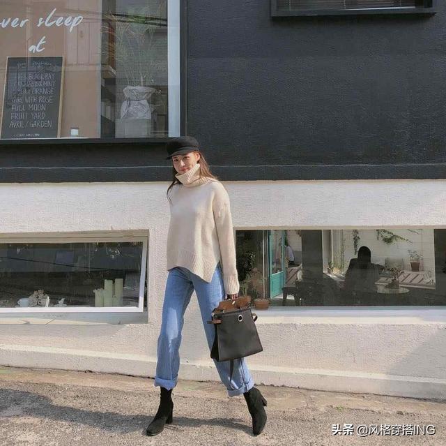 搭配毛衣+單鞋/高跟鞋,深秋穿搭,搭配毛衣效果也不錯,如圖一緊身毛衣內紮搭配寬鬆牛仔褲,超級顯身材,圖片的同色係穿搭很顯時尚,上身胖的女生最好不要挑戰橫條紋,可以選擇素色黑色這類色彩,圖二直接外穿毛衣。這種寬鬆版型的毛衣顯胖顯壯,所以上身偏胖的女人謹慎選擇.偏瘦的MM當然可以借鑒,搭配一雙高跟短靴,很顯氣質的穿搭哦.
